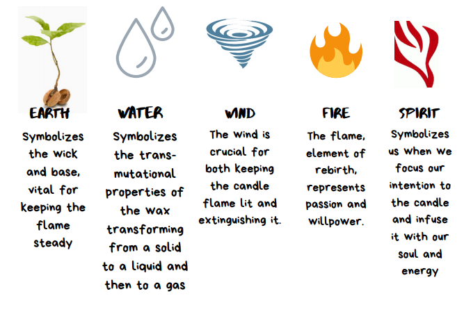 On a symbolic level, lighting a candle represents the five elements: earth, water, air, fire and spirit. The wick and base signify earth and are vital for keeping the flame steady. The wax transforming from a solid to a liquid and then to a gas, emulated that trans-mutational properties of the water element. The air is crucial for both keeping the flame lit and extinguishing it. Then the flame, element of rebirth, represents pass ion and willpower. And the spirit is us when we focus our intention to the candle and infuse it with our soul and energy. Many believe that an intention candle can deliver a miracle. Its no wonder we all make a wish when we blow out a birthday candle!